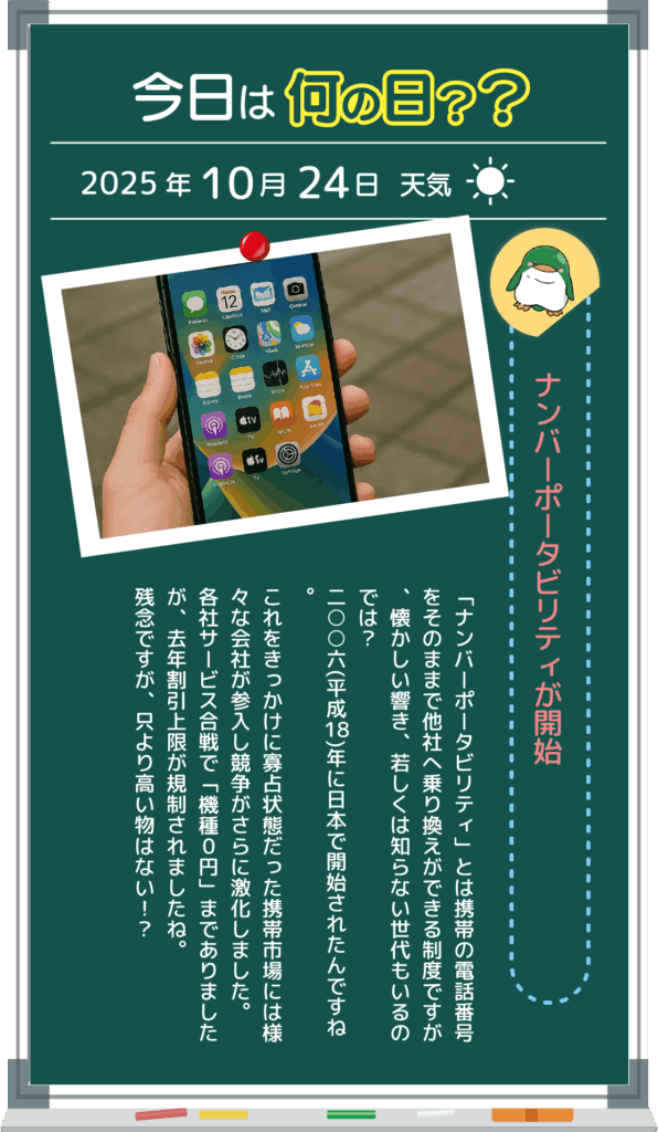 2025.10.24 デルタブログ ナンバーポータビリティが開始 < 前へ 一覧へ戻る カテゴリ ・すべて ・お知らせ ・デルタブログ アーカイブ ・ 2025.10(17)・ 2025.09(20)・ 2025.08(16)・ 2025.07(24)・ 2025.06(21)・ 2025.05(20)・ 2025.04(22)・ 2025.03(20)・ 2025.02(19)・ 2025.01(19)・ 2024.12(22)・ 2024.11(6)