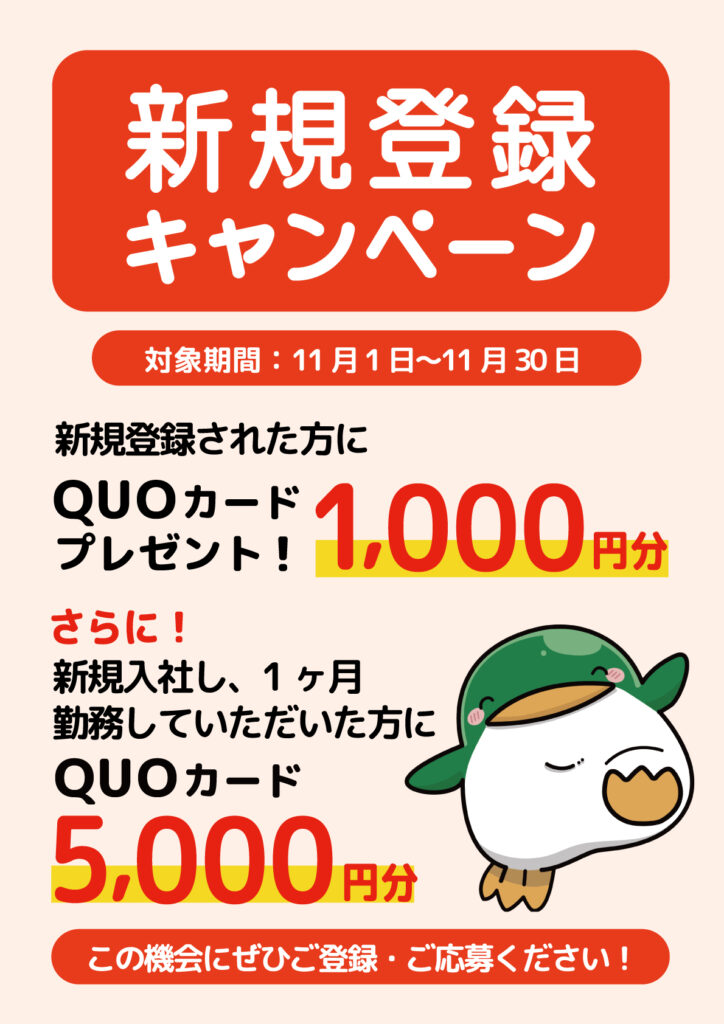 2025.10.31 お知らせ 新規登録キャンペーン 11月1日〜11月30日の「1ヶ月限定」キャンペーンを実施します! この期間に新規登録していただいた方に、【1,000円分】のQUOカードをプレゼント! さらに、新規入社し1ヶ月勤務していただいた方には、【5,000円分】のQUOカードをプレゼントします! この機会にぜひデルタ四国へお越しください!! < 前へ 一覧へ戻る 次へ > カテゴリ ・すべて ・お知らせ ・デルタブログ アーカイブ ・ 2025.10(23)・ 2025.09(20)・ 2025.08(16)・ 2025.07(24)・ 2025.06(21)・ 2025.05(20)・ 2025.04(22)・ 2025.03(20)・ 2025.02(19)・ 2025.01(19)・ 2024.12(22)・ 2024.11(6)