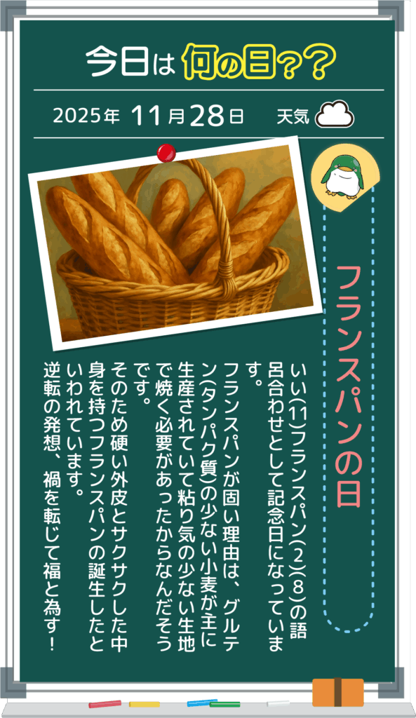 2025.11.28 デルタブログ フランスパンの日 < 前へ 一覧へ戻る 次へ > カテゴリ ・すべて ・お知らせ ・デルタブログ アーカイブ ・ 2025.12(1)・ 2025.11(17)・ 2025.10(23)・ 2025.09(20)・ 2025.08(16)・ 2025.07(24)・ 2025.06(21)・ 2025.05(20)・ 2025.04(22)・ 2025.03(20)・ 2025.02(19)・ 2025.01(19)・ 2024.12(22)・ 2024.11(6)