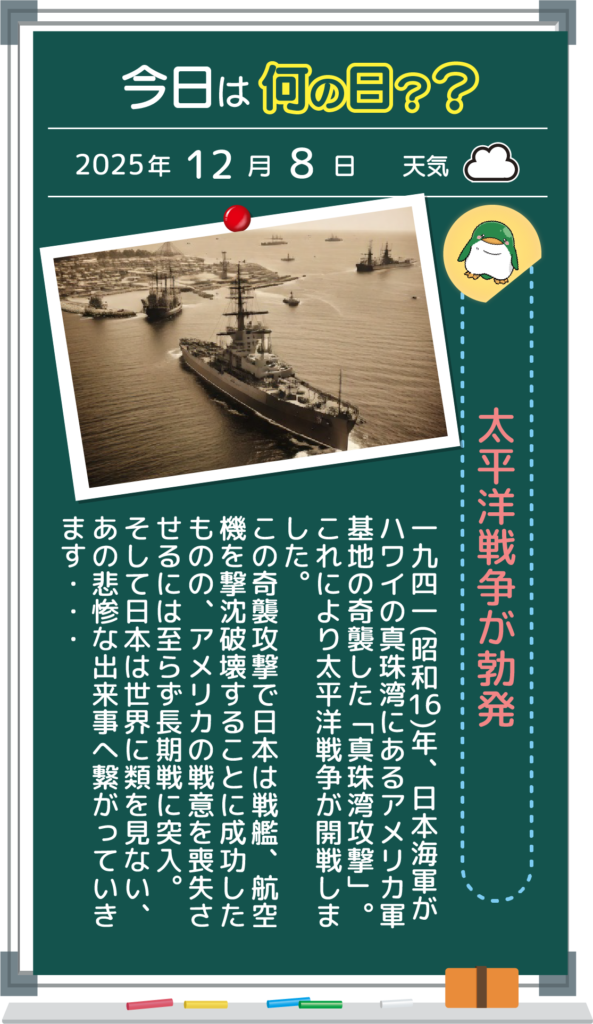 2025.12.08 デルタブログ 太平洋戦争が勃発 < 前へ 一覧へ戻る カテゴリ ・すべて ・お知らせ ・デルタブログ アーカイブ ・ 2025.12(6)・ 2025.11(17)・ 2025.10(23)・ 2025.09(20)・ 2025.08(16)・ 2025.07(24)・ 2025.06(21)・ 2025.05(20)・ 2025.04(22)・ 2025.03(20)・ 2025.02(19)・ 2025.01(19)・ 2024.12(22)・ 2024.11(6)