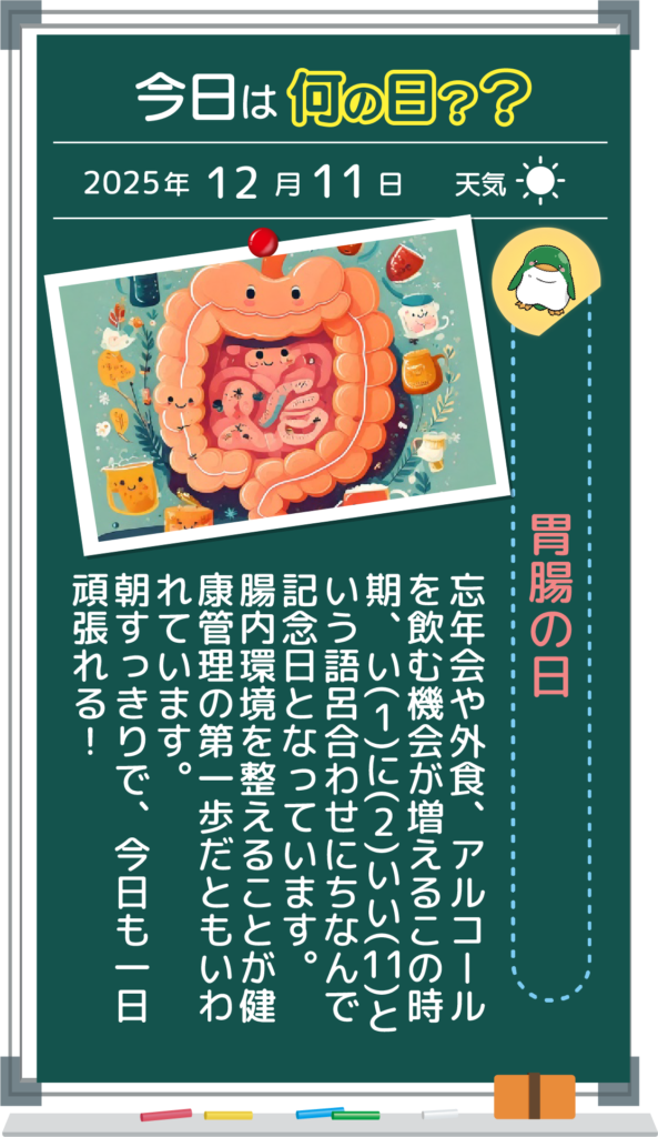 2025.12.11 デルタブログ 胃腸の日 < 前へ 一覧へ戻る 次へ > カテゴリ ・すべて ・お知らせ ・デルタブログ アーカイブ ・ 2025.12(11)・ 2025.11(17)・ 2025.10(23)・ 2025.09(20)・ 2025.08(16)・ 2025.07(24)・ 2025.06(21)・ 2025.05(20)・ 2025.04(22)・ 2025.03(20)・ 2025.02(19)・ 2025.01(19)・ 2024.12(22)・ 2024.11(6)