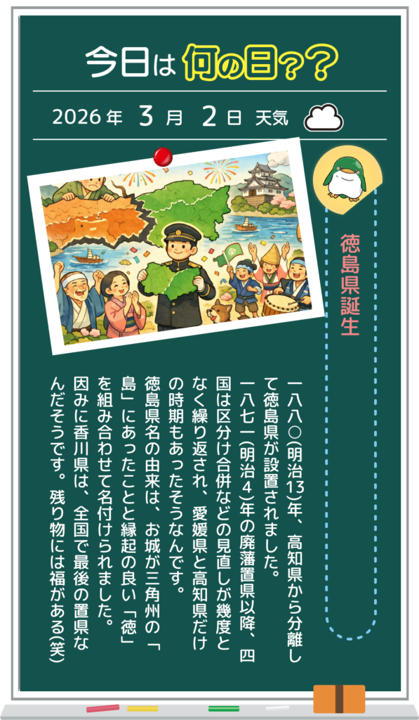 2026.03.02 デルタブログ 徳島県誕生 < 前へ 一覧へ戻る カテゴリ ・すべて ・お知らせ ・デルタブログ アーカイブ ・ 2026.03(1)・ 2026.02(18)・ 2026.01(20)・ 2025.12(22)・ 2025.11(17)・ 2025.10(23)・ 2025.09(20)・ 2025.08(16)・ 2025.07(24)・ 2025.06(21)・ 2025.05(20)・ 2025.04(22)・ 2025.03(20)・ 2025.02(19)・ 2025.01(19)・ 2024.12(22)・ 2024.11(6)